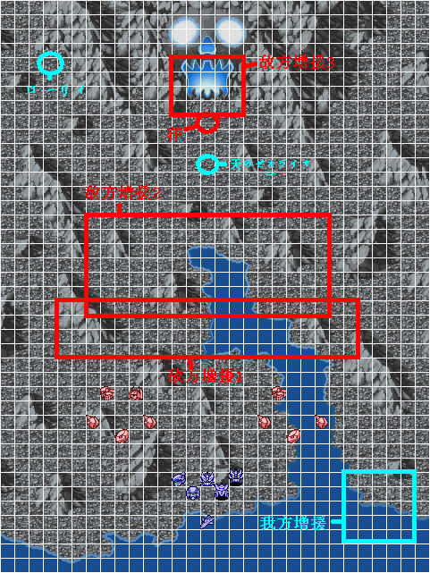 | 战术指南: 初期基本就是过场剧情,将敌人HP削减到一定程度就可以了。剧情发生之后只有ボルテスV一机,敌人实力也比较强,还是退远点好慢慢对付敌人好。我方增援出现在右下角,一开就往那里退,这样比较容易消灭敌人。敌人的BOSS还是会逃的,老规矩了,大家也应该熟悉了才对。 |