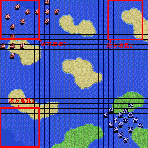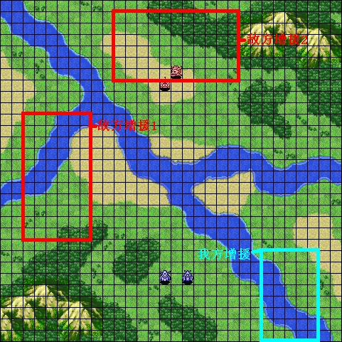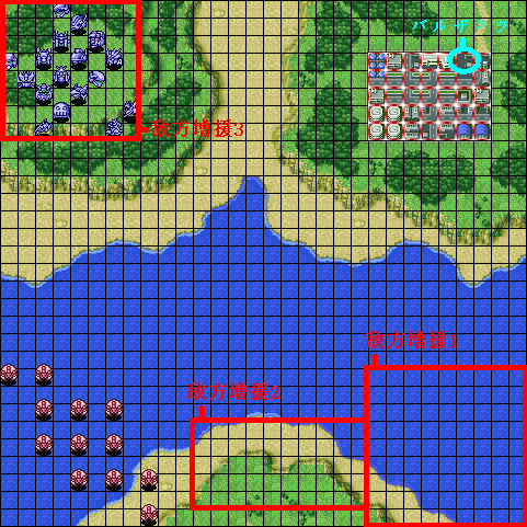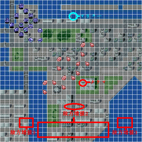 | 战术指南: 虽然是要保护发电设施,但初期敌人是离设施比较远的,因此可以在中途就拦截下来,但是第二批敌人出现在右下,因此部队也不能离发电设施太远了。エビル在发生剧情后就撤退,因此也不用急着去攻击他,而且又要保卫发电设施事实上也是腾不出手的。 第三批敌人出现在左上,但是这时的主要问题在于失控的ブレード,由于不能击坠他,所以走路的时候要小心他的攻击。 |