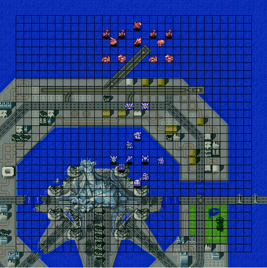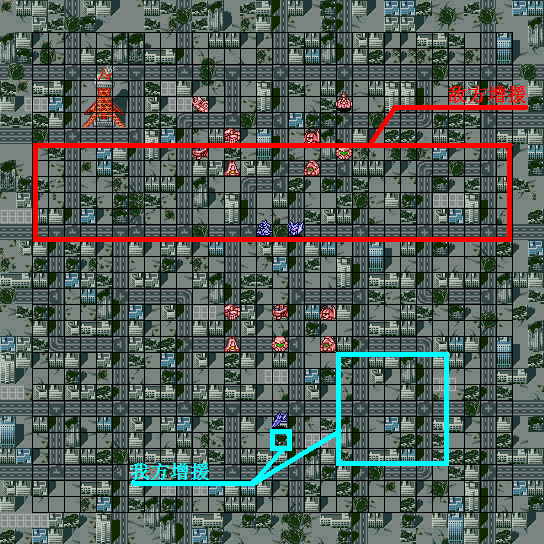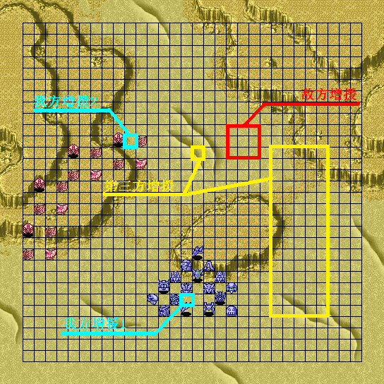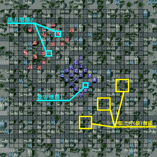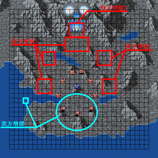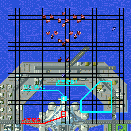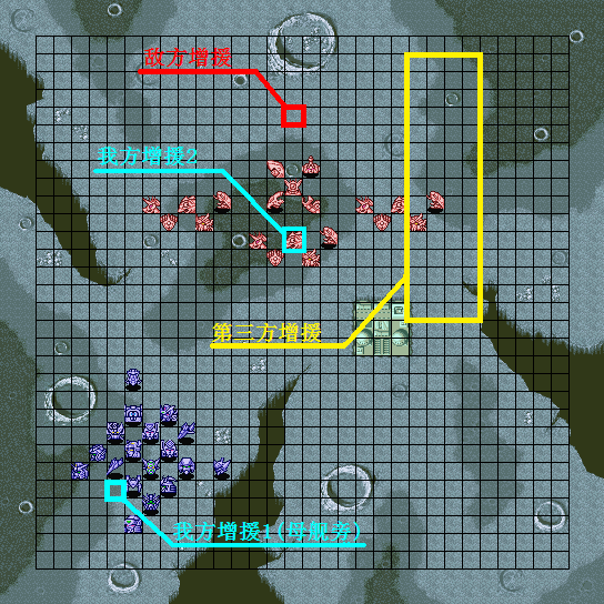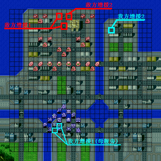 | 战术指南: 完整出击,向上平推就是了。初期敌人剩余16机后两个麻烦的人出现,タクマ一出来就使用铁壁、集中、觉醒,而且每回合都会用……下一回合宗介和ヒイロ增援,再下一回合トロワ增援,同时发生剧情。在剧情发生前还是离ベヘモス远一点的好……剧情后他不再使用铁壁这才打的伤它,但击破セイナ后他会使用热血和必中,要注意这点。 |