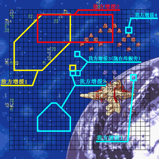 | 战术指南: 如果仅要完成胜利条件的话很简单,两个テッカマン往上直冲就是了。胜利条件达成后就会要求我方清光小兵,还是两个テッカマン打主力。 初期敌人除两个天王外全灭后,剧情发生,我方大部队增援。而后敌人大幅度增援,很有挑战性……不过,一开始ガォガイガー和ブレード都是被敌人包围的,如果没有好好改造的话,那就要自求多福了。另外还要注意敌人的MAP炮,被打中可是很疼的…… |