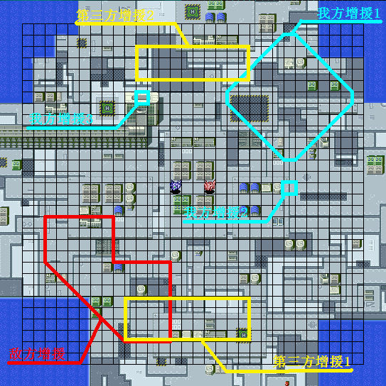 | 战术指南: 初期敌人很少,所以只要派少数兵力上去,其余人原地等候。敌人的第一波增援出现在地图右侧和左侧。エビル回避非常高,所以不用急着去消灭他。シンクライン和エビル只能击破一个,当然如果有水平用MAP同时解决掉就最好了,不过只能打一个的话,我推荐干掉皇太子,因为他比较容易打中…… アルムストラ和アルムアルクス也是一个完蛋另一个就撤退,两个人身上的东西都不算好,看在SP-5%的份上还是アリア更有吸引力。不过他们两个的攻击带有很多状态,アルムストラ还能两动,全中后估计也废了…… |
