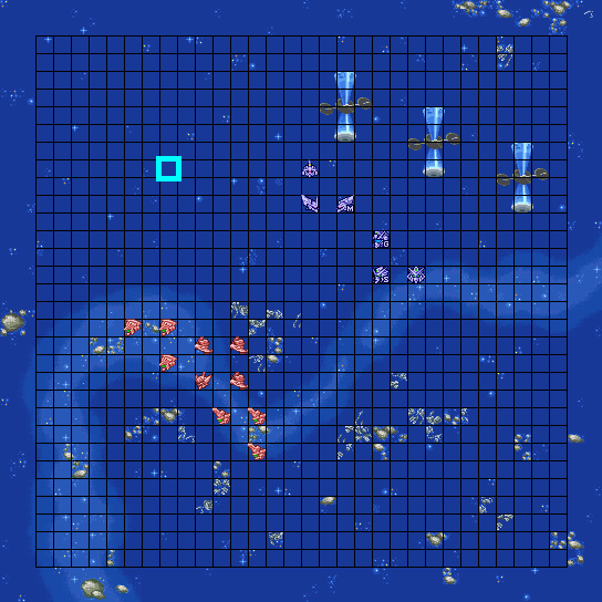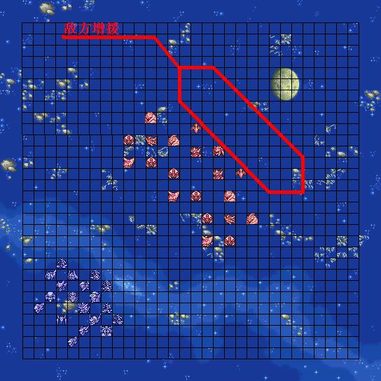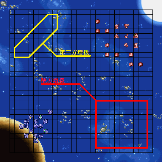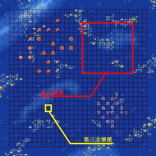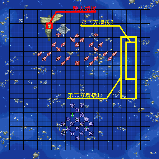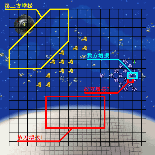 | 战术指南: 就那么几个人,如果他们对应的机体没有什么改造的话还是乖乖退到卫星上防守反击吧。 后半也没什么难度,都是打过交道的敌人,相信都知道要怎么去对付。アプリカント还是会两动,所以不建议一堆人一起冲上去,最好分散从四周上去。 |