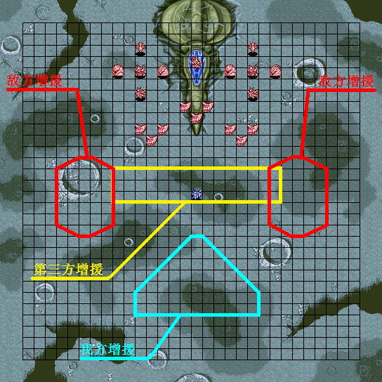 | 战术指南: 开始只有ブレード一机,建议让他直接攻击オメガ引发剧情,然后找个机会躲到后面去,等イバリューダー战到全灭后,我方的援军也就到了。我方援军到后ブレード会全恢复,但是只有4回合的时间消灭オメガ,全力冲吧…… |