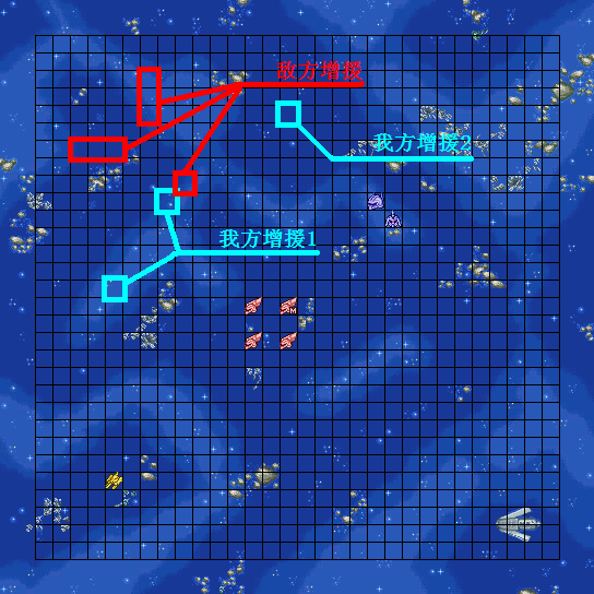 | 战术指南: 劾每回和使用必闪和集中,唯一击破他的方法就是当他攻击时主动反击把他的必闪耗掉,然后下回合挂必中热血KO掉他。第三回合劾还在的话会强制发生剧情,所以要在上一回合就结果掉他。两人再度出现后,SP是会补满的,所以不用吝啬。击破劾发生剧情,新敌人增援,我方增援等等。敌人剩余1机后,イバリューター增援,与リーブ战斗后会发生剧情,主角回来了!ロウ的垃圾船也可以使用,リーブ随后撤退,要一击杀掉她是不大可能的…… |