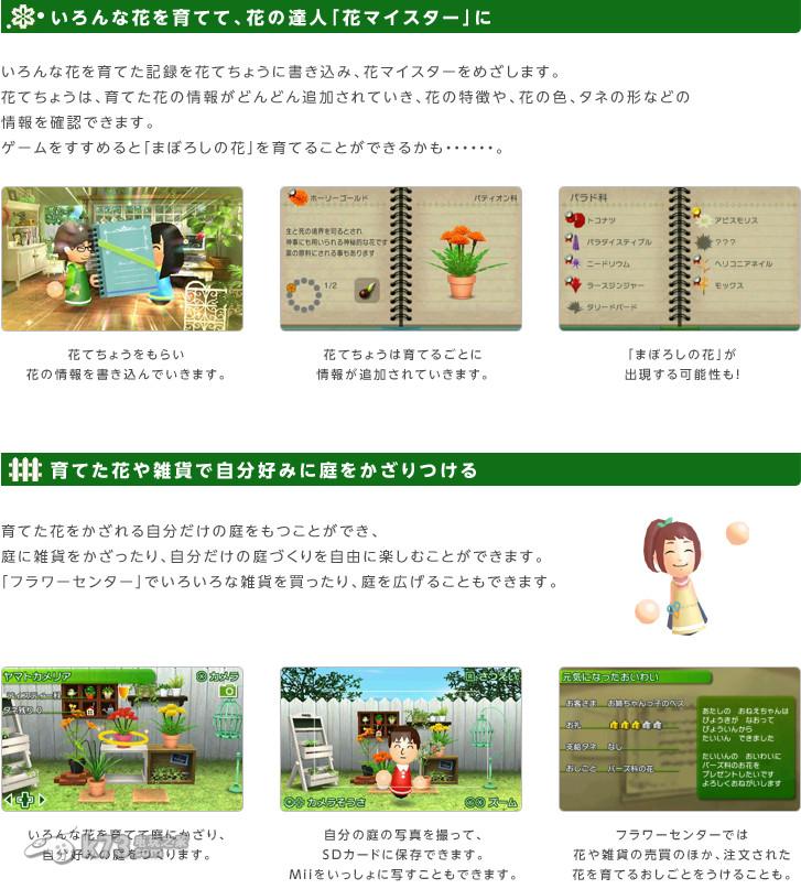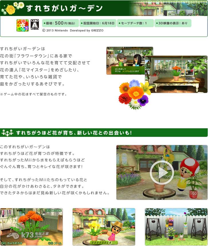 《擦肩花园》的特征是根据擦肩程度来培育花朵。擦肩的Mii会给鲜花浇水。将从擦到的Mii那里得到的花朵与自己的花朵交配能收获种子,也许会长成你未见过的魅力花朵。