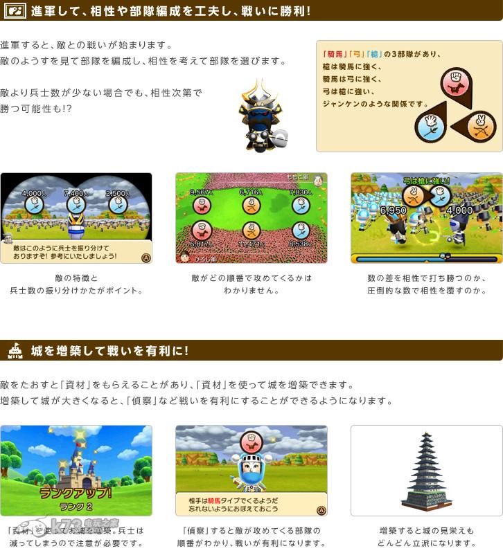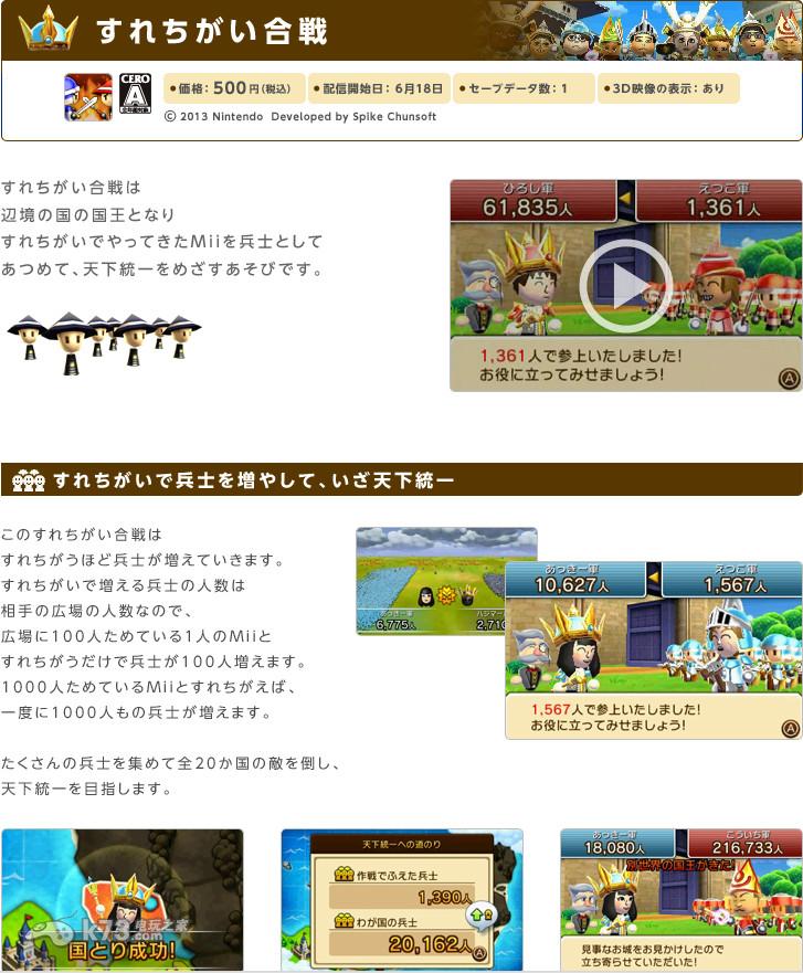 在《擦肩合战》中,玩家将化身为边境国王,将擦到的Mii作为自己的士兵一一统天下为目标。