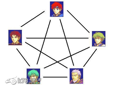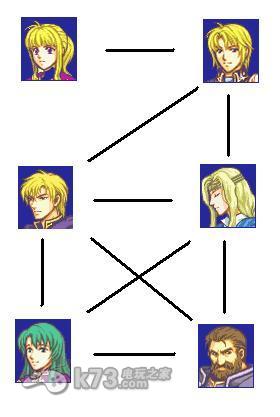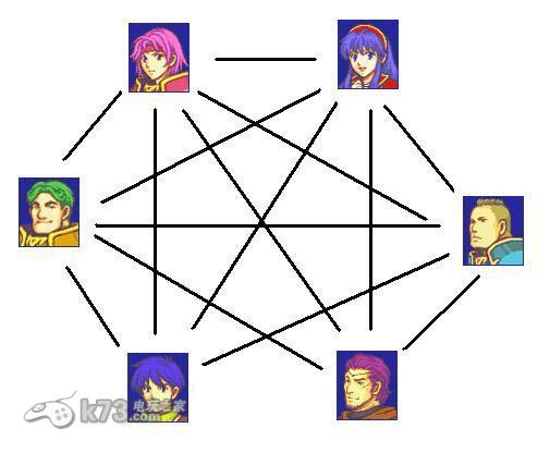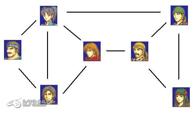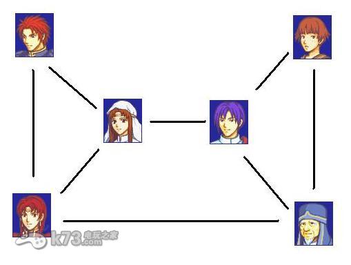 共6人,除了佣兵奥吉尔不能和密探盗贼支援外(很合理的设定),其余角色皆可在网内相互支援,组成近乎完全封闭的支援网络。