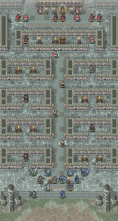 本章很多房间都锁着,需要用门钥匙打开。另外需要注意的是一些房间里除了有宝箱外还有敌人,因此开门前记得部署好部队以防万一,其中右边上数第二个房间里有龙人,左下房间有拿着远程魔法的司祭,需要注意。另外还需要注意的是中间拿着必杀弓的狙击手。个人建议如果整体部队实力不怎么高的话还是不要兵分两路了,慢慢推进才是上策。10回合后右边会出现圣骑士的增援需要注意。第二回合魔法师エッツェル会登场(如果第一回合直接传送杀死骑士打开门口不会出现)我们不用去理会,只要过关时他还活着的话下章就会加入我方。杀死门前的骑士后BOSS区域出现,本章的BOSS又是将军,直接拿锤子砸吧。