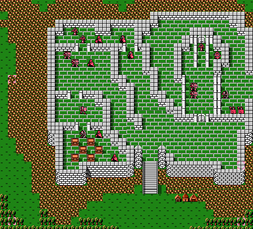 | 本关的目标是夺回アリティア城,并把城里的敌人都消灭掉。前进路线有好几种,但为了得到宝箱最开始应该先牵制住敌方盗贼。通往宝箱房间的路上会碰到敌方由弓箭手、装甲兵以及魔道士组成的混合部队,其威力可想而知。一旦受伤应该尽快往回撤,不能冲的太猛,也可以考虑用转移杖。魔法攻击对敌BOSS无效,用ドラゴンキラー直接攻击几乎是唯一的办法。最右边的两个僧侣一个拿着全体回复杖,一个拿着会员卡(秘密商店就在王座后门那里),一定不要放过。虽然隔着墙攻击也不是不可能,但最好的办法是从王座后门绕过去。 |