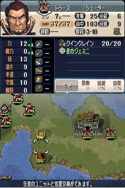 左边的两个村庄中,其中一个可以获得放下吊桥的はね橋のカギ,值得一提的是这一章如果想要收マチス的话,个人建议还是从左边绕远路吧。一开始,天马骑士パオラ会在右上角登场,只是她的站位在右边龙骑士的攻击范围之内,所以推荐一开始让她飞出龙骑士的攻击范围,并且最好在上面的要塞中待机,一来可以避免过早与龙骑士交手造成伤亡,二来正好可以截杀盗贼,三来正好可以对付之后的援军部队,由于N难度下援军很少,以パオラ的登场实力完全能够应付。主力部队在前行过程中,要小心中间弩车的骚扰,命中虽然不高但是威力很大,尤其是修女要小心,别被秒杀了。本章另外两个村庄访问分别可以收到斧男サジ和盗贼ジュリアン,而中间的マチス需要用ジュリアン说的。另外假如我们把吊桥放下的话,マチス会立即主动攻击,如果不放吊桥而绕到上面的话,要小心右边龙骑士的攻击范围,建议让防御高的将其一个个吸引过来,然后魔法师和弓箭手上前消灭,对付中间的骑兵建议等他们冲过来之后一口气消灭,多多利用主角的特效武器吧。另外,原作中BOSS旁边的隐藏道具“アイオテの盾”本作中消失,斗技场也取消了。