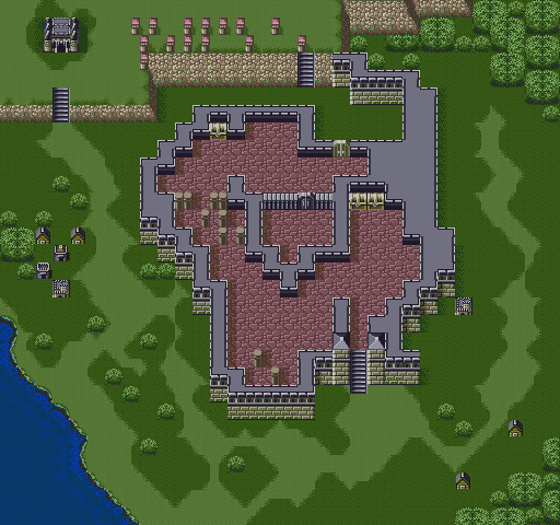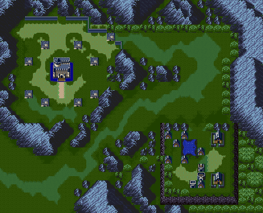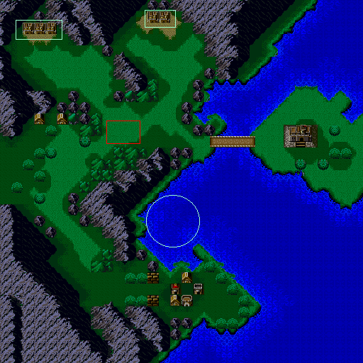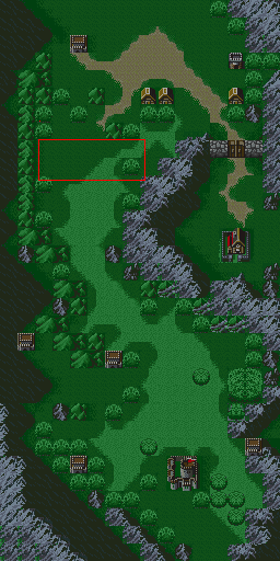 观察地图,右下都是我方部队,而且武器店、道具店、竞技场这些建筑都有,这样就足够保证了补给。虽然地图很大,但这并非辽阔的平原地形,都是有山隔开的道路,左下还有不少林地地形,并且形成了两个山谷的形状,只有一条通路,正是“一夫当关,万夫莫开”。骑士的移动力优势受到了很大限制。