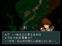 接下来就好办了,敌人的龙骑士虽然移动起来很讨厌,但能力不强,左方的那队让魔法师或魔法剑就能解决,右边一队则用斧或枪来对付,需要注意的是别让左边那队偷袭主城,其实有了飞马,这也不是什么大问题。还有就是别忘了让ファバル和セティ打斗技场。 リーフ到右图位置会有剧情,虽然只是一句无关紧要的话,但最好还是把它完成了吧。 |