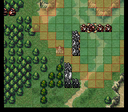 | 第6回合:拉克西丝、拜奥沃夫和米迪尔各能干掉一个重甲打开通路,辛格尔德占城。 乔安移动到西尔维娅能跳舞的地方,艾丝琳和他对话得到地枪。菲恩要冲在最前面,并装备银枪。这回合要让他得到移动指环,这要求他的力量必须达到26。 |
