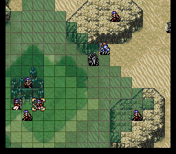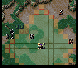 | 第3回合:拉克西丝拉雷文,利用圣风干掉圣斧。西尔维娅全速移动给辛格尔德等三人跳舞,拜奥沃夫帮助辛格尔德打开通路后移动到右图位置,辛格尔德占城。拉克西丝在右图中位置拉辛格尔德。菲利要尽量靠近菲诺拉城,最好装备雷剑防远程魔法。艾婷把克罗德传过去,克罗德移动到西尔维亚身边。有必要的话可以使用太阳杖。 | |