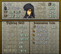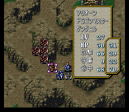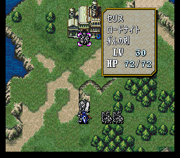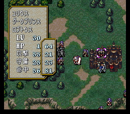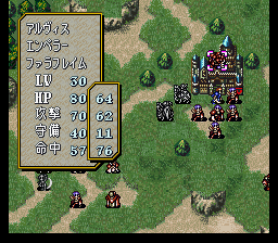 | 阿雷斯干掉挡路的魔法师,利夫拉夏南。反复S/L让夏南命中阿尔维斯至少3次,如果夏南能硬抗一记圣火的话就直接让他命中4次送皇帝陛下归天。右图是两人的命中率。如果只命中3次的话就要让塞利斯把他干掉,但用银大剑要命中阿尔维斯两次,命中率只有30;用勇者枪如果夏南力量长满的话还需命中3次,否则要4次,而命中率也只有50。夏南利用骑士指环让开城口,塞利斯占城。 | ![]() |