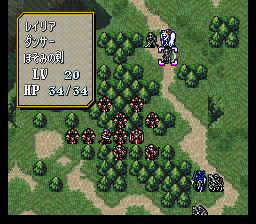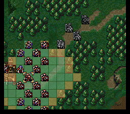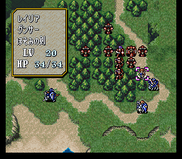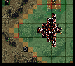 | 巴哈拉城下,大家要吸引十二魔将中能打两格的下来。其中菲和琳达必须移动到图中位置,大家尽量靠在一起防止三角攻击。本回合反复S/L,要保证菲和琳达的安全且菲上方只能剩一个紧贴她的敌人(飞马三姐妹之一),十二魔将中的暗魔法师不向下移动。这里菲要装备光剑把十二魔将中攻击她的全部反击掉,琳达可以装备祈祷剑。至于其他人,能否活下来已经无关大局了。 | ![]() |