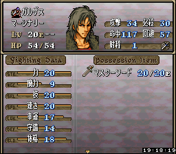 如果前一关南娜(ナンナ)的LV已经到20,那么在这里就方便一些:先让我方一人不要携带任何武器,故意让加尔扎斯(ガルザス)捕获,这样他的能力就减半了,SPD与SKL只有10,这样先用南娜(ナンナ)用大地之剑攻击间接两次[有利夫支援,这样的话,在两击中一般都有一击是必杀的,而加尔扎斯(ガルザス)的HP高得要命,所以不用担心会杀了他,这里可以视南娜(ナンナ)的魔力成长如何而决定是否使用MAC+7的圣水],之后再用菲尔格斯(フェルグス)在南娜(ナンナ)的支援下用勇者剑扑获。