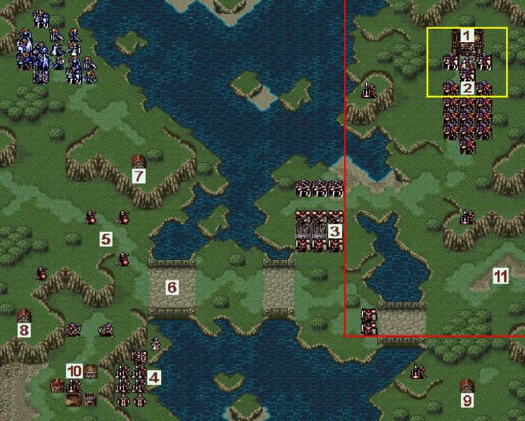 1)6号桥消失:我军任意人进入红色线内的区域后敌方行动回合时6号桥将会消失(也就是变成河流)