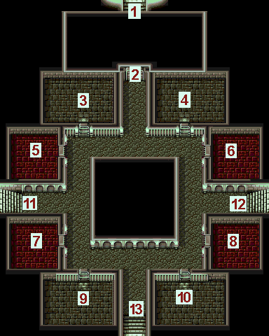 | 开始后拉拉打开8号门,布莱多恩向上方行进对付枪兵及重甲(建议不要主动攻击,直接利用怒反击的方式对付敌人),玛秋娅攻击下方的枪兵。第二回合拉拉开门救利菲斯,利菲斯则从拉拉身上取得盗贼钥匙并把玛秋娅的宝箱钥匙给拉拉。在这之后可以兵分两路:拉拉从8号房间取得盗贼钥匙后就去负责开4号位的门救NPC,之后负责去开6号位的宝箱;利菲斯则先救出9号位的主角,之后负责去开7、3、5号位的门;宝箱钥匙由玛秋娅从拉拉身上重新取回后,再与利夫等人合作利用前几章接力的方法(这次是物交换不是人交换)传递钥匙开宝箱。 |