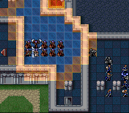 | 一上来我们要面对1号位的4个重甲和4个法师,可以考虑在重甲下6格的地方让达鲁西恩、布莱多恩、菲尔格斯、利夫4人一字排开(火把可以在第一回合放,也可以考虑和赛梯他们汇合之后再放),在敌方回合重创重甲。当然这样做多少有些风险,RP不好挂了人就RESET重来吧。到了第二回合就可以集中注意力料理法师了,这时卡琳、玛秋娅对他们也能造成有效伤害,利菲斯也可以利用盗窃武器的方法直接封杀一个法师单位。 |
