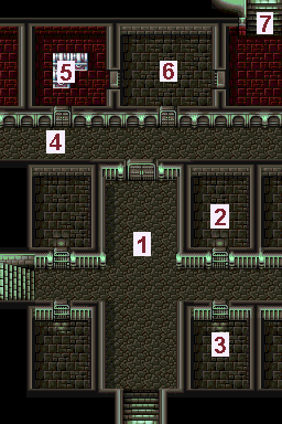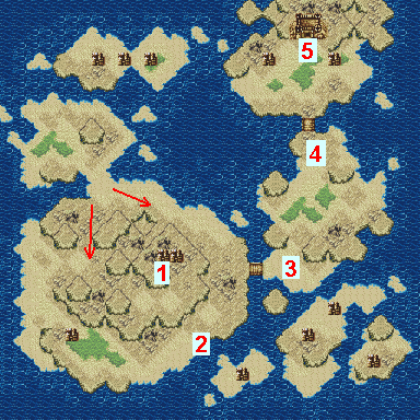 | 说得阿斯贝尔后,还要小小的分兵一下:5号房间有2个宝箱:勇者之剑和生命戒指都是要尽量入手的,铁大剑(左上角的宝箱)倒是拿不拿无所谓。需要留意的是那里有一个拿恶魔斧的重甲,一不留神就可能阴沟里翻船,最好还是开门后直接由阿斯贝尔间接攻击干掉。6号房间的敌人不少,开门后可以让达鲁西恩在门口顶一回合,或者干脆把疯之勇者扛到前面替我们顶。主教身上有把祝福杖,有余力的话可以考虑让达鲁西恩俘虏。过关前建议把赛梯之书放到阿斯贝尔身上,下一章第一回合就有练级机会。 |