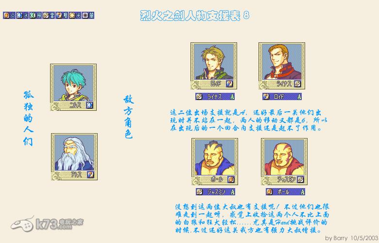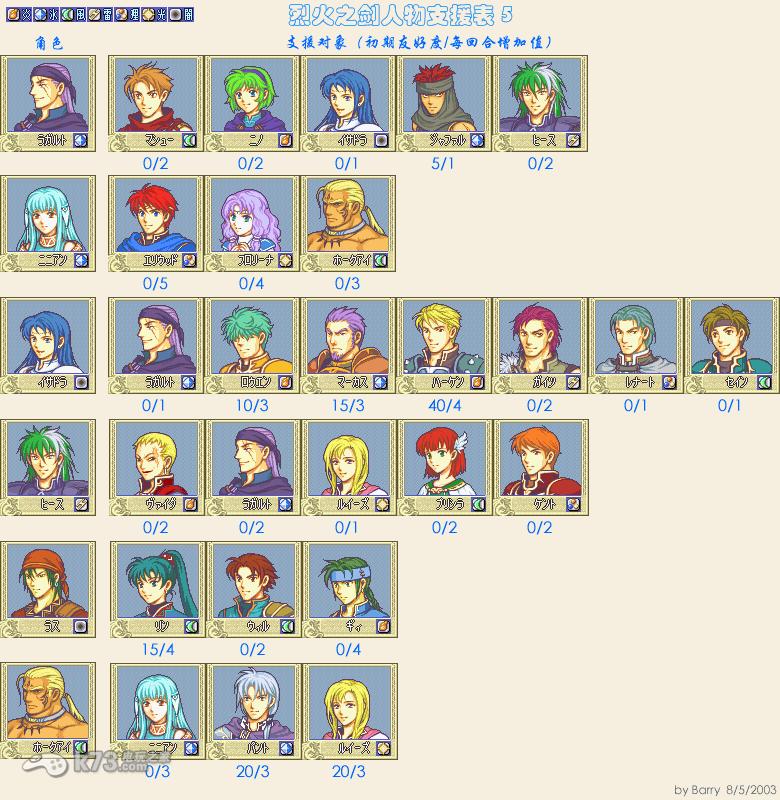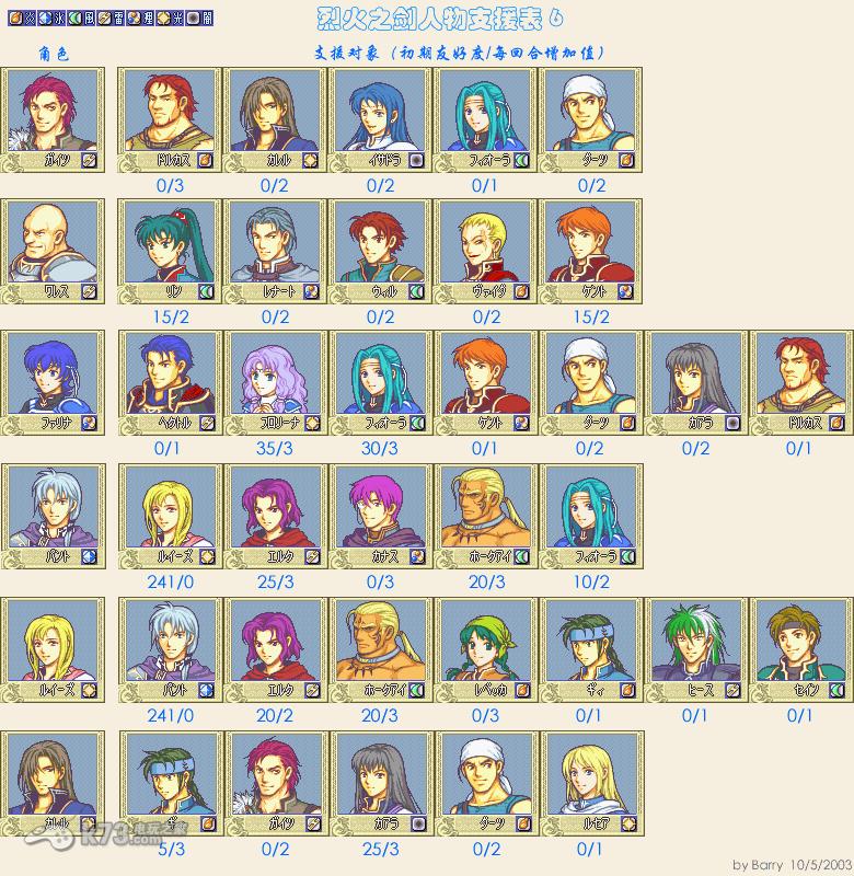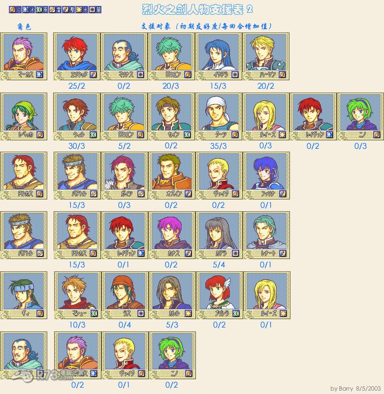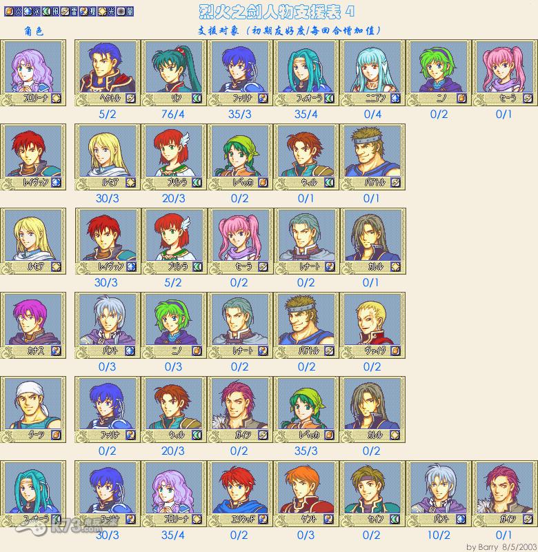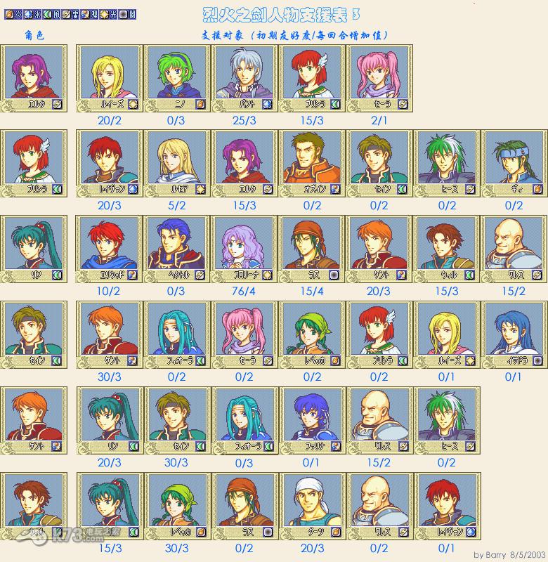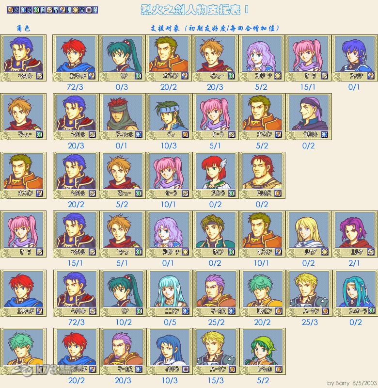 《火焰纹章烈火之剑》继承了系列熟知的人物支援关系系统,某些特定的角色之间会进行相互或单方面的支援,受到支援的角色在能力方面会得到暂时性或几回合内的提升,这对于战斗来说影响甚大,下面就给大家带来本作人物支援关系的图表。