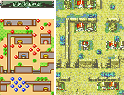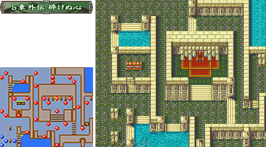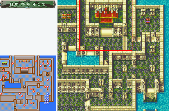 | 攻略: 前期共通路线的最后一章,可以看作一个阶段的完结吧~本章有3个宝箱,但是没有开宝箱的钥匙,因此盗贼是一定要出来的。这里玩家的队伍如果实力够的话可以选择兵分两路,主力部队往上方攻,剩下派两个人往左边去和第二回合开始时出现在左下角的男主人公部队会合,当然最好有两个会用杖的角色出战,可以保持两边的战力持久。如果觉得保险点为好的话,先会合后再一起行动也行。右上的宝箱房间里全都是皮厚的重铠兵,鉴于特效武器有限,魔法师必不可少。地图上方的3个弓手,拿的都是射程为2~3的长弓,不要不小心把飞马或修女送进他们攻击范围了。第四回合敌方行动结束时,地图左下出现3个骑士增援;我方任意角色到达BOSS房间下方地区时,中央楼梯出现1个盗贼,上方出现2个魔道士增援。把杂兵清理干净以后,就剩下职业为将军ジェネラル的BOSS了,这是我军第一次打上级职业的BOSS,他的能力比起以前的BOSS来也确实比较突出(是第一个BGM为“强敌出现”的BOSS呢),得到玉座的加成后物防和魔防都相当可观,连魔法也很难伤到他,再加上银枪使得他的攻击力非常恐怖。打他的时候一定要先诱使他使用投枪,如此可以降低他8点的攻击力,同时命中和回避也会下降,然后使用两个主人公的特效武器以及以前得到的アーマーキラー一鼓作气消灭他。 心得: ★☆攻击左上方损坏的墙壁来打通连接左右两边的路。 ★☆3个宝箱左到右依次为ぎんの剣(银剑),天空のムチ(天空之鞭),天使の衣。 ★☆本章结束后得到10000G,出现分支选择,进入女主人公エイリーク路线或男主人公エフラム路线。 敌: LV6重甲*1(铁枪) LV8重甲*4(钢枪 右边门外的带绿色门钥匙) LV6重甲*1(钢枪) LV8重甲*1(铁枪) LV7重甲*2(钢枪) LV6弓箭手*1(铁弓) LV6枪兵*1(铁枪) LV6弓箭手*1(长弓) LV7枪兵*1(钢枪) LV7弓箭手*1(钢弓) LV8枪兵*4(钢枪) LV8弓箭手*2(长弓) LV7佣兵*2(钢剑) LV6巫师*1(溶流) LV8佣兵*1(钢剑) LV8巫师*2(熔流) LV6剑士*1(铁剑) LV6魔法师*1(闪电) LV7战士*1(钢斧) LV7魔法师*2(闪电) BOSS LV1将军(银枪 投枪) 敌人增援: 5回合初在男主角出现的地方 LV8骑士*3(分别带钢剑、钢枪、铁枪) 我军任意单位进入BOSS房间所在区域(图中标明) LV10盗贼*1(铁剑 盗贼钥匙) BOSS房间两侧走道尽头出现 LV7魔法师*2(闪电) 要点补充: 尽量不要用LV比较高的人与BOSS战斗,这样只会增加大盾出现的几率,浪费武器。刚转过职的高级职业是最佳的选择。 |