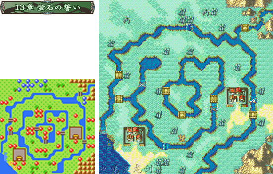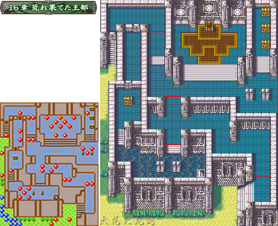 | 攻略: 战斗开始开始前,职业为マムクート(龙人)的ミルラ(梅尔)会加入,她使用的龙石只能攻击50次,要节约。不过她升级很快,让她打些等级高的敌人,一个就可以升1级。部队出场位置为左下,进攻时有两条路可选择,右下的入口,以及左上的门,从左上走的部队要小心房间里面的神官带有混乱杖。第5回合结束时,右下出现ヴァルキュリア(女武神)和3个フォレストナイト(丛林骑士)增援,右侧出现2个贤者增援,城内下方阶梯处出现盗贼1个。注意增援的贤者带有催眠杖。第8回合结束时,左下出现グレートナイト(重骑士)和6个ソシアルナイト,其中グレートナイト身上带有赤の宝玉。15回合结束,右边3个宝箱下方出现盗贼增援,不过这时想必各位已经到达这里了吧^^BOSS前方的3个ドルイド持有射程3~10,且能让我方HP减半的魔法,不过命中极低,威胁不大。BOSS就是以前背叛我们的圣骑士オルソン,不过比起前两章的皇帝和帝国将军,实力还是比较弱的,用骑兵特效武器打吧。 心得: ★☆左边的宝箱为トマホーク,右边的3个宝箱从上到下为魔よけ、騎士の勲章、5000G。 ★☆本章结束后,男女主角可以转职,转职时选否的话可以暂时不转,转职道具会保留下来。同时得到男女主角专用的双圣器【炎枪】ジークムント和【雷剑】ジークリンデ。 敌人配置: LV12重甲骑士*2(铁枪) LV12重甲骑士*2(铁枪 门钥匙) LV12重甲骑士*1(投枪) LV14修道士*4(闪光) LV15佣兵*4(铁剑) LV14魔法师*2(火炎) LV14枪兵*2(铁枪) LV12战士*2(铁斧) LV14战士*1(铁斧) LV14剑士*2(铁剑) LV8勇士*1(钢斧 英雄之证) LV14巫师*2(熔流) LV14巫师*1(月光 宝箱钥匙) LV13神官*1(治愈之杖) LV13神官*1(治愈之杖 伤药) LV14神官*1(狂乱之杖) LV10德鲁伊*3(吸星 月食) LV5德鲁伊*3(熔流) BOSS LV13圣骑士(银剑 锁链枪) HARD难度下追加的敌人: BOSS下方追加LV3剑圣*2(钢剑) 德鲁伊下方追加LV12重甲骑士*2(钢枪) 敌人增援: 第5回合结束时,出现在中下房间内的阶梯处。 LV18盗贼*1(铁剑 盗贼钥匙) 第15回合结束时,出现在右上角 LV18盗贼*1(铁剑盗贼钥匙) 进入左上门内或者越过右下红线(两个是同一触发点) 左下我军出场的地方: LV3重骑士*4(钢斧 赤色宝玉) LV15骑兵*6(钢剑3 投枪2 钢枪1) 进入城内后,从上方越过红线,或者进入下方的房间,或者越过中间的红线,敌人回合结束时出现在右下角: LV3丛林骑士*3(钢剑) LV3女武神*1(神圣之光) 同上,出现在右上角: LV5贤者*2(睡眠之杖 神圣之光) 要点补充: 1, 我军起始位置与女主角篇不同,而敌人的增援也会出现在这里,要注意不要落单。 2, 敌人的第1个盗贼比较容易狙杀,第2个盗贼出现在右上宝箱附近,如果15回合还未能达到那里,那么很难再保住那5000G 3, 敌人增援的贤者比较烦人,本章仍然是典型的男主角路线,魔法型敌人较多,异常杖多。所以魔防高的角色在男主角篇会很活跃。 |