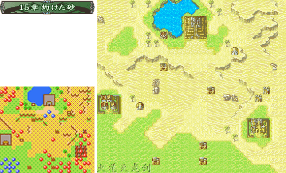 | 攻略: 本章是沙漠地形,正如出击前剧情中提到的,骑兵会走得很慢,尽量派飞行部队和魔法师系的出战。一开始女主角エイリーク会和狙击手ヒーニアス以及贤者サレフ出现在地图上方皇宫处,因为敌人会主动进攻那里的并不多,所以3人只要利用城门固守等待救援就可以。敌人聚集在左上及右下,由两个BOSS率领,都是熟悉的老面孔了,左上是【虎目石】ケセルダ,右下是【月长石】ヴァルター。我方主力部队出现在左下角,派两个飞行部队上去增援,其余人可以选择先攻右下的敌部队,只要别杀死ヴァルター,这是为了之后挖宝方便,反正他不会主动移动。第2回合结束开始上方会出现天马骑士增援,第2回合2只,第3和第4回合4只。第3回合开始右下的两个小城出现骑士增援,持续3回合。右下BOSS附近有拿混乱杖的神官骑士,拿远程暗魔法的敌人身上有導きの指輪可以偷。第7回合地图左下会出现数量相当多的敌增援,又是偷袭后方的……这次比起以前无论是数量还是质量都比较高,要小心。同时上方会出现3个魔道士增援,持续2回合。顶住敌人的猛烈攻击,同时把下面清得只剩ヴァルター一个人之后,就可以让一个飞行单位载着盗贼去挖宝了,其余人则可以攻打右上的ケセルダ队,相比之下他这里已经没什么增援,数量也比下面少得多,所以很轻松就可以搞定,唯一需要注意的是ケセルダ和ヴァルター不一样,只要有人进入他的攻击范围便会主动进攻,注意这点以免实力较差的人白送给他打。最后剩下ヴァルター,他身上带着的フィーリの守護可以让弓对他的特效消失,因此可以先偷过来,然后用弓消灭他。不过即使不这样,他的能力也不如上一章的皇帝,而且对龙特效的武器对他也有作用。 心得: ★☆所谓挖宝,就是在地图上埋藏的宝物,盗贼走到一定范围内待机便可得到,其他人运气越高则得到的几率越大,不过还是建议让盗贼去挖,毕竟RP这东西说不好……具体请看这里。 ★☆访问村子可以得到マスタープルフ,作用是让除两个主角外,所有达到转职条件并且有高级职业的低级职业转职。 ★☆本章结束后得到双圣器冰剑アウドムラ和风刃エクスカリバー。 敌人配置: LV13佣兵*1(铁剑) LV5狂战士*1(龙斧) LV11佣兵*2(铁之大剑) LV6狂战士*1(恶魔斧) LV14佣兵*1(铁之大剑) LV13龙骑士*11(钢枪) LV13巫师*1(月光) LV13巫师*5(熔流) LV11战士*2(铁斧) LV13巫师*1(熔流 月食 指引之戒) LV11战士*1(战锤) LV12战士*3(铁斧) LV13战士*2(铁斧) LV13剑士*2(铁剑) LV14骑士*2(钢枪) LV4从林骑士*2(钢剑) LV4圣骑士*1(银枪) LV3神官骑士*1(治愈之杖) LV3神官骑士*1(狂乱之杖) LV14弓箭手*2(铁弓) BOSS: LV12勇者(银斧 回旋斧 波布罗的护符) LV13翼龙骑士(银枪 锁链枪 菲利的护符) 敌人增援: 第3回合开始时,在地图右上角出现: LV13天马骑士*2(钢枪) 一共3回合 第4回合时,城堡上方和下方的2个要塞出现 LV13天马骑士*2(钢枪) LV14骑士*2(钢枪 其中一个还装备投枪) 天马一共2回合,骑士持续3回合 第8回合开始时,上方城堡的左边,右边一共出现: LV13魔法师*2(火炎) LV13魔法师*1(闪电) 一共2次 左下男主角出现的地方: LV4圣骑士*1(钢剑) LV14骑士*2(钢枪) LV13魔法师*2(火炎) LV14魔法师*1(闪电 特效药) LV13战士*2(钢斧) LV13佣兵*1(钢剑) 要点补充: 1, 左上角的勇者BOSS和右下角的翼龙不同,他会在我军进入其攻击范围后主动出击。 2, 不要将部队停留在原地,7回合末就有大批敌人增援出现在我军开始的地方 3, 本关盗贼需要偷窃的道具有两个,一个在增援身上,一个在那个不会移动的巫师身上。 ———————————————————————————————— 道具店出售物品一览: 在大地图上进入时,无变化 闪电700 地狱火1200 闪光630 阳光900 神圣之光2500 熔流900 月光4200 治疗之杖1000 复原杖2000 魔防杖2250 伤药 300 特效药3000 圣水900 解毒药450 |