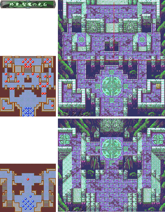 | 攻略: 终章了,照例是分为两个部分的。 第一部分,只要击倒BOSSリオン就可以,不用把魔物全灭,胜利条件里那个条件无视吧。唯一的难点就是左右两边的龙尸了,也是无视防御的攻击,防和血都很高,不过只要先清了附近的杂兵再引下来杀,就没有问题了。当越过左边通道时,左上出现5个アークビグル增援;越过右边通道时,右上出现4个デスガーゴイル增援。踏上上方的阶梯时,最上方开始出现ヘルボーン增援,每回合3个,持续10回合。BOSSリオン的强悍就不用多介绍了,54的攻击力挨一下实在不好受啊,不过只剩下他一个那也就是穷途末路了…… 第二部分,同样只要击倒魔王就行。论能力魔王还是很强的,一定要拿双圣器去打,好在双圣器数量实在够多……接近魔王时,不要让他有机会使用那范围1~3的攻击,不然范围内的人都会被催眠。消灭魔王之后就慢慢欣赏结局吧^^ 心得: ★☆第一部分两个宝箱,左为マスタープルフ,右为天使の衣。 ★☆魔王是不能瞬杀的,不过他吃贯通,而且也没有必杀免疫,真是够可怜= = LV5骷髅战士*14 钢枪*7 钢枪 门钥匙*1 钢枪 宝箱钥匙*1 钢剑*1 钢剑 门钥匙*1 必杀剑*1 投枪*2 LV6骷髅战士*3(必杀剑1 破枪剑1 破斧枪1) LV7蛇女*2(魔幻的波动) LV8蛇女*1(魔幻的波动 石化光线) LV7蛇女*2(魔幻的波动) LV7蛇女*3(魔幻的波动 石化光线) LV5毒巨蛛*2(猛毒之爪) LV7毒巨蛛*1(猛毒之爪) LV5地狱三头犬*1(焦热之牙) LV8地狱三头犬*1(焦热之牙) LV5骷髅弓箭手*2 (钢弓) LV10尸龙*2(死亡吐息) LV8半人马*1 (破剑斧) BOSS 里昂 LV18亡灵巫师(纳格尔法尔) 敌人增援: LV6亡灵石像鬼*4 (钢枪3 破斧枪1) 进入右边红线区域下回合在左边出现 LV6大眼魔*5 (魔眼光线) 进入左边红线区域下回合在右边出现 特殊增援: 接触BOSS下方的阶梯。(必须接触)下回合开始BOSS上方的阶梯开始出现3只高级骷髅的增援,装备随即,有可能携带掉落物品,一共持续10回合 |