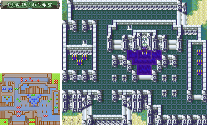 | 攻略: 晚上……准备好照明工具先。因为作战目的是保护NPC,而敌人基本上都在城外出现,所以基本思路是用优势兵力守住上下两个出入口。虽然敌人初始并不多,但是从第1回合结束开始下方就会连续出现大量增援,有マージナイト(魔法骑士)、ウォーリア(勇士)、フォレストナイト(从林骑士)、パラディン(圣骑士)、グレートナイト(重骑士)、ソードマスター(剑圣),连续8回合到第8回合结束。上方则是从第2回合开始到第7回合结束,有ウォーリア、スナイパー(狙击手)、勇者。他们全部都是高级职业而且拿银质武器,因此防守的时候也不能大意。由于守住上下的出入口,因此城里面比较平静,但也不是绝对的,一开始城内右下有两个拿斧头的战士,要派些人过去消灭他们并且守侯在那里。第5回合结束,在城内的左下右下两侧会出现盗贼增援,第6回合右下还会出现一个盗贼,不要让他们抢走了宝箱。至于拿宝箱方面,因为本章一共只有13回合,靠一个盗贼去取两边的宝物,基本上是来不及的,因此最好一开始就派两个盗贼系角色分别去两边开宝箱。最需要注意的,就是第8回合结束开始到11回合为止,在城内右下出现的ジェネラル(将军)和ウォーリア增援了,若一开始没有在这里保留人手,那么这里的NPC就会被杀光了,这也是为什么要派人在这里守侯的原因。最后敌人的BOSS是个司祭,在左下角,因为他所拿的A级光魔法是可以得到的,所以一定不要放过他。由于杀了他就可以直接过关,所以不想多缠斗的玩家可以直接杀了他了事,而想把敌人消灭光的玩家则要把他留在最后消灭。 心得: ★☆左边3个宝箱,从左到右为ルーンソード(卢尼之剑)、はやての羽(疾风之羽)、ノスフェラート(诺斯费拉特),右边3个宝箱从上到下为リザーブ(生命之杖)、5000G、サンダーストーム(雷暴)。 ★☆右边宝箱房间上面通道的尽头处是隐藏商店,要进去别忘了带会员卡和银卡~ ★☆8个重甲NPC(教皇和将军不算),存活4名以上,可以得到ひかりの剣(光之剑),以保护左上两个和右下两个为目标吧。 ★☆过关后得到最后两件双圣器【光辉】イーヴァルディ和【圣杖】ラトナ,以及10000G。 敌: LV4将军*1(勇者之枪) LV5将军*1(钢枪) LV5德鲁伊*2(月光) LV18佣兵*2(钢剑) LV5勇者*1(勇者之剑) LV4剑圣*2(钢剑) LV17战士*2(铁斧) LV18重甲骑士*2(钢枪) LV18剑士*2(钢剑) LV17弓箭手*2(钢弓 注意右边那个带了女神像) LV5勇士*2(钢斧) LV5勇者*2(钢剑) LV5狙击手*1(勇者之弓) LV5狙击手*1(银弓) BOSS LV16司祭(光轮) 敌人增援: 原剑圣的位置,第2回合开始出现: LV4剑圣*2(银剑) LV6重骑士*1(银斧) 持续7回合。 BOSS附近第3回合开始出现: LV5魔法骑士*1(地狱业火) LV5丛林骑士*1(银弓) LV5勇士*1(银斧) LV6圣骑士*1(银枪) 持续7回合 右上角3回合开始出现: LV6勇士*1(银斧) LV5狙击手*1(银弓) 第4回合改为: LV5勇者*2(银剑) 持续6回合 第6回合时,左下,右下的宝箱房间附近: LV18盗贼*2(铁剑 盗贼钥匙) 第7回合右下还会再增援一个 第9回合时 右下角原本增援盗贼的地方: LV6将军*2(银枪) 10回合时换成 LV5勇士*2(银斧) 持续4回合 要点补充: 1, 宝箱的东西都不错,没有放弃的理由,所以盗贼系一定要出场,因为6回合时就有敌人的盗贼增援,所以只派一个盗贼上场的情况下没有先去的一边要派人守住。 2, NPC想全救出的难度不小,不光是实力弱的缘故,这些家伙还特别好战,左上,左下的4个基本上第1回合就会因为找事被灭掉。如果想救他们,左下方的2个,可以让骑兵类抗起来。因为他们的处境最危险。。左上的第2回合他们行动时会主动攻击,一般不会有生命危险。。我军回合时抗起来吧。。。想救他们上方一定要有2个能抗的起重甲的人。。相对来说右边的4个基本上没有生命危险,第1回合时记得扔一个角色去吸引2个战士反击。最后右边宝箱那里最好放几个比较强的角色,9回合时的增援也是能要了那几个NPC的命的。。好在保证4个NPC重甲无事就行,不需要全部救出。 —————————————————— 隐藏商店出售物品: 新月刃 1200 锁链枪 9000 战斧 1000 治愈之杖 3750 天使之衣 8000 能量之环 8000 秘传之书 8000 疾风之羽 8000 女神像 8000 龙盾 8000 英雄之证 10000 骑士勋章 10000 猎户座之箭 10000 天空之鞭 10000 指引之戒 10000 霸者之证 10000 在大地图上有武器店和道具店: 武器店出售: 银剑 1500 银之大剑 1800 必杀刃 1300 破枪剑 1800 银枪 1200 必杀枪 1200 破斧枪 1950 银斧 1000 必杀斧 1000 破剑斧 2100 银弓 1600 必杀弓 1400 短弓 1760 长弓 2000 道具店出售: 闪电 700 地狱业火 1200 阳光 900 神圣之光 2500 熔流 900 月光 4200 治疗之杖 1000 痊愈之杖 2250 复原之杖 2000 伤药 300 特效药 3000 解毒药 450 圣水 900 |