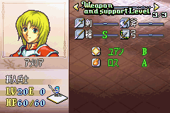 当然,也可以把尤恩的一个B级支援分成两个C级分别给塞勒夫和阿米莉娅,或者干脆直接给阿米莉娅(那还要塞勒夫干什么?),但是可以看到,无论怎样分配,这样的选择都会少得到约等于一个B级的支援效果,因此罗斯的最佳A级支援应当是阿米莉娅。罗斯一共可以得到的支援修正为:攻击+3.5、防御+2.5、命中率+17.5%、回避率+20%、必杀率+25%、必杀回避率+7.5%。这样,手持黑斧的罗斯实际能力为攻击53 、防御25、命中170、回避116、必杀59、必杀回避37,非常可怕。