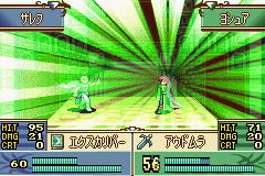 剩下的3人则比较有意思。先暂且不看他们的支援效果,就从角色本身的特点考虑,露忒如果上场,肯定是带ェクスカリバ-的,但前提是必须吃4个体格药,职业无论从哪方面看都应该选择贤者,当然如果剧情模式中为了追求移动力而转了魔法骑士的话,这里就要必须塞勒夫替代了,虽然魔力要低2点,但不仅可以少吃2个体格药,在支援方面也要优于前者,是更好的人选,后文会具体说明。而不论选择谁,在不出必杀的情况下都不可能两下解决任何对手,只能依靠速度上的优势欺负一下对手的低速角色(如果有带的话),并不能成为斗技场的主力,事实上要是没有风刃那5点的SPD修正,光是因为那低下的物理防御,这个职业也是基本要被抛弃的;接下来的阿米莉娅,可以选择的职业有大骑士、将军和强化新人兵士。这里,大骑士是最鸡肋的,理由也是只有移动力高而已,而新人兵士虽然拥有强大的职业上限和额外15%的必杀补正,但是,29的速度和只能使用枪系武器的致命伤使得她反倒成为了最差的选择,要是能够用剑或者对手没有出黑斧的话倒是很值得使用。剩下的将军可以说是本作最有魅力的职业了,速度低就低点儿吧,反正早就有被追击的觉悟,但是29的物防在多数角色攻击力处于35到43之间的时候具有什么样的意义不言而喻,最过分的是免疫一切攻击的大盾那20%的发动率往往会在关键时候让对手抓狂,正是因为有了这个保命的利器,才使得将军在斗技场中有了一拼之力,使用勇者剑的将军是谁都会感到头疼的。基于这个原因,阿米莉娅至少是罗斯所有支援中必不可少的;最后的尤恩是3人中唯一应该转为新人职业的,理由十分简单,在使用S暗魔法ナグルファル(从隐藏人物利昂身上得到)的情况下,同样只有26攻速的尤恩却拥有全员最高攻击力29+25=54,这就让他有了对抗黑斧的可能: