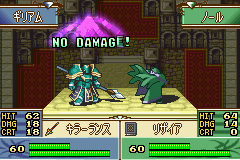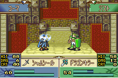 这个和上面的情况就大不一样了。在同样都是3下KO的情况下,アウドムラ的命中就要高出一个档次了,再加上アウドムラ的魔防+5的修正使得就算被黑斧的反击命中也不会立刻被尤恩秒杀,因此完全可以放手一搏,只不过遗憾的是,对手行动时只要黑斧不主动攻击,下回合还是没有机会干掉,虽然是较为稳妥的打法,但是结果将直接影响到后面的进程。