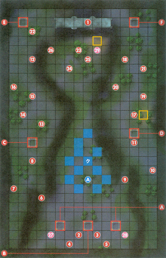 | 出撃人数 12人 勝利条件 敵将撃破 攻略要点 我 方被困在山道之中被敌方上下包围,敌方这次还有了狙击手而且普通弓兵都装备了长弓。战斗如果直接在中间采取守势的话会被敌方猛烈的夹攻,一是直接速度冲下 去占领下方的三个砦堵住敌人的援军出击,二是从两面的山道上逃上去,因为是只能单人通过的窄道,可以有效的拦截敌人的追击,而且这样不会浪费宝贵的经验。 敌人BOSS屍兵将 职业ウォーリアー 不会行动胜利条件也是敌将击破,那就放到最后解决吧。 我方人员 第一回合 ヘンリー ダークマージ Lv.12 ルイン エルファイアー 調合薬 过关后加入 ルキナ ロード Lv.10 裏剣ファルシオン レイピア 初期配置1.尸兵将 猛士 (秘传之书) 2.战士 3. 战士 4. 剑士 5. 剑士 6.战士 7.战士 8.剑士 9.剑士 10.剑士 11.战士 12.弓手(长弓) 13.弓手 14.狙击手 15.战士 16.剑士 17.弓手 18.弓手 19.狙击手(银弓) 20.战士 21.战士 22.剑士 23.猛士(银斧) 24.剑士 25.战士 26.战士 H: 27.弓手 28.弓手 29.弓手 1.屍兵将 ウォーリアー Lv.6 ショートアクス 秘伝の書 (可掉落) 2,3,6,7,11,15,20,21,25,26.屍兵 戦士 Lv.16 4,5,8-10,16,22,24.屍兵 剣士 Lv.16 12.屍兵 アーチャー Lv.16 ロングボウ (可掉落) 13,17,18.屍兵 アーチャー Lv.16 19.屍兵 スナイパー Lv.2 銀の弓(可掉落) 23.屍兵 ウォーリアー Lv.2 銀の斧 (可掉落) 敌增援 第四回合(H、L为第三回合) A.屍兵 剣士 Lv.16 B.屍兵 戦士 Lv.16 第五回合(H、L为第四回合) C.屍兵 戦士 Lv.16 D.屍兵 剣士 Lv.16 第六回合(H、L为第五回合) A.屍兵 ウォーリアー Lv.2 x2 H难度下添加 C.屍兵 ウォーリアー Lv.2(L难度为屍兵 スナイパー Lv.2) L难度下添加 D.屍兵 スナイパー Lv.2 第七回合(H、L为第六回合) C.屍兵 剣士 Lv.16 D.屍兵 戦士 Lv.16 L难度下添加 A.屍兵 剑士 Lv.16 x2 B.屍兵 戦士 Lv.16 第八回合(H、L为第七回合) C.屍兵 戦士 Lv.16 D.屍兵 剣士 Lv.16 E.屍兵 戦士 Lv.16 F.屍兵 剣士 Lv.16 H难度添加(L难度下职业为ウォーリアー) A.屍兵 剣士 Lv.16 X2 B.屍兵 戦士 Lv.16 |