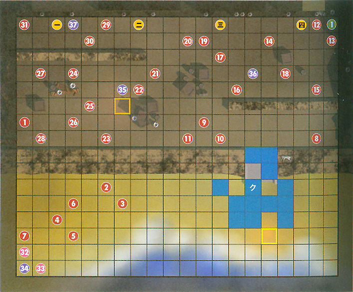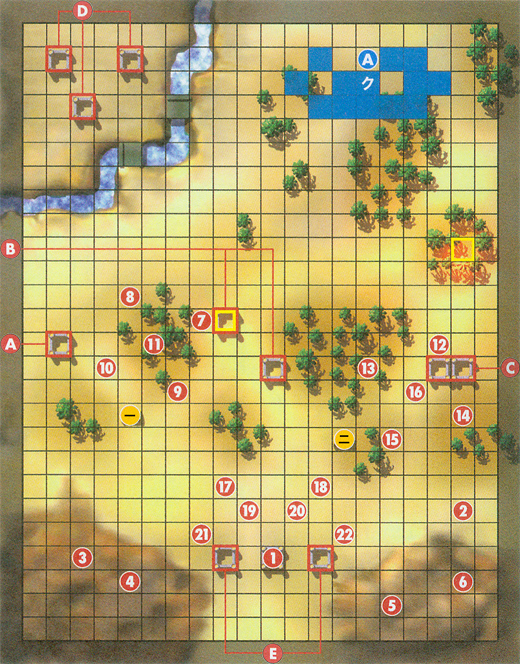 | 出撃人数 13人 勝利条件 敵全滅 攻略要点 没有武器的サイリ一开始会被两名重甲堵在角落里,虽然有一定的回避率而且身上有个调合药,但最坏的结果也是几回合就挂的事,所以我方要赶快上去救她。因为地形的关系海岸线 上的敌人移动力很低,一开始可以不用理会全军向上压进在路口出吸引火力,飞兵把主角或强力角色越过障碍运送过去。这关没有援军BOSS也不会移动所以不算太难。 我方加入人员 赛莉(サイリ) 剑圣 LV1 装备:调合药 クロム会話后加入 初期配置 1.ハーフェン ダークナイト Lv.8 ボルガノン マスタープルフ (可掉落) 2.ヴァルム兵 ダークナイト Lv.3 ギガサンダー (可掉落) 3,9-10,14-15,24-26,30.ヴァルム兵 ソシアルナイト Lv.19 4.ヴァルム兵 ジェネラル Lv.3 ハンマー (可掉落) 5,12-13,16,19,21-22.ヴァルム兵 アーマーナイト Lv.19 8.28.ヴァルム兵 ジェネラル 11,17,23,31.ヴァルム兵 魔道士 Lv.19 20.ヴァルム兵 ソシアルナイト Lv.19 鋼の槍(可掉落) 27.ヴァルム兵 ダークナイト Lv.3 トロン 29.ヴァルム兵 ソシアルナイト Lv.19 鋼の剑(可掉落) H: 32,33.ヴァルム兵 魔道士 Lv.19 L: 34,35.ヴァルム兵 魔道士 Lv.19 36.ヴァルム兵 ジェネラル Lv.3 37.ヴァルム兵 ダークナイト Lv.3 村庄访问 一 访问获得横转证。 二 访问获得术书。 三 访问获得远愈杖。 四 访问获得金块(大) |