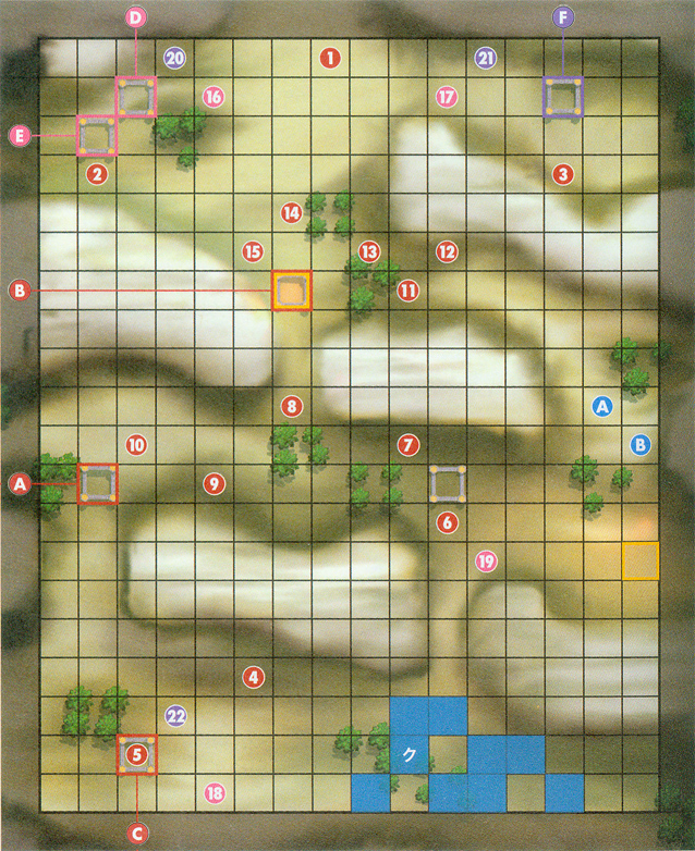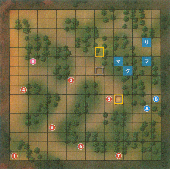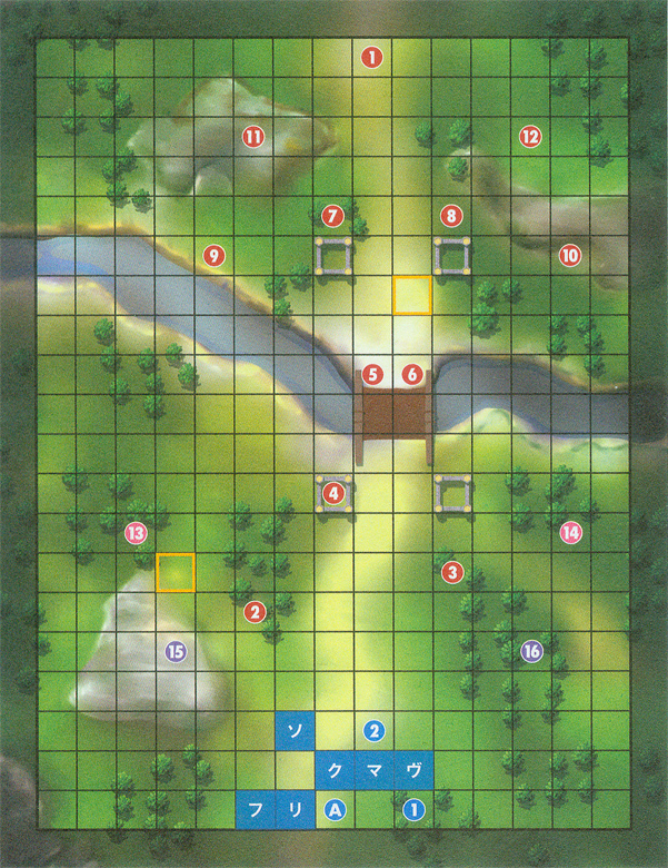 | 出击人数 2人 胜利条件 敌全灭 第一关难度自然是比较低的,往右直奔BOSS去即可 下屏幕有一些操作教学新玩家可以看看 我方配置 (蓝色) 1.库洛姆(クロム) LV.20 ロード 装备:封剣ファルシオン 銀の剣 hp41 力20 魔3 技17 速 15 运18 守20 魔防14 2.myunit LV20 戦術師 装备:トロン 鋼の剣 hp38 力16 魔14 技15 速13 运16 守15 魔防17 敌方配置(本攻略配置为基于H难度,下面有N,H,L配置不同的解说,数字代表地图上的标记蓝色为我方红色为地方,下文以后不再赘述) 1.法维达(ファウダー) ソーサラー Lv.5 魔書ギムレー hp39 力5 魔21 技15 速13 运12 守15 魔防12 不同模式变化 无 |