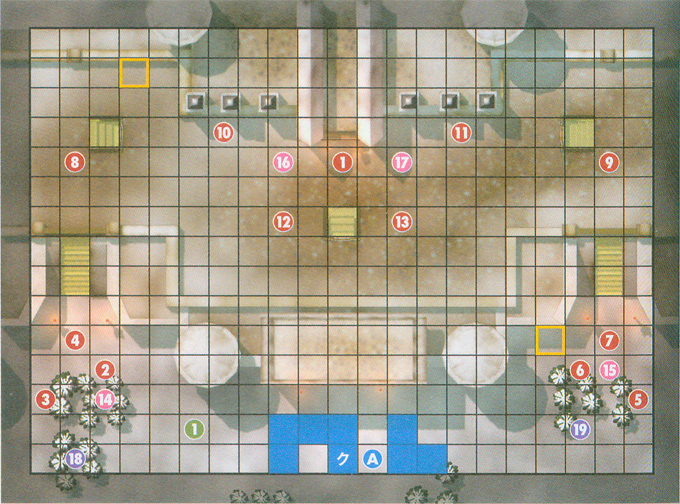 | 出击人数 9人 胜利条件 敵全滅 国王在正式开打前会提醒城寨里有伏兵。开场直接让正太法师和大小姐组队,让大小姐驼着往大部队跑;下方直接组个队伍车掉碍事的蛮族,剩下的人留一队清理下方杂兵其余的都往上方走。上方3个飞行单位会在进入其攻击范围时出击,最上方一批敌人避免从中央突击免得被车死。 我方新加入角色 第一回合 A 利希特(リヒト) 魔道士 LV3 装备:エルウインド hp20 力3 魔8 技6 速5 运10 守6 魔防3 B 玛丽亚贝尔(マリアベル) 神官骑士トルバドール Lv.3 リライブ 傷薬 hp18 力0 魔5 技4 速6 运5 守3 魔防6 敌方配置 1 アーリオ ドラゴンナイト Lv.9 ショートアクス 金塊(中)(掉落) 2,3 ぺレジア兵 ドラゴンナイト Lv.7 鉄の斧 4,6,9,11,14 ぺレジア兵 蛮族 Lv.5 鉄の斧 5,7,13 ぺレジア兵 ダークマージ Lv.5 ミィル 8,12,15 ぺレジア兵 剣士 Lv.5 鉄の剣 10 ぺレジア兵 魔道士 Lv.5 ファイアー H,L难度增加 16,17 ぺレジア兵 ドラゴンナイト 18 ぺレジア兵 蛮族 19 ぺレジア兵 剣士 L难度增加 20,21,22 ぺレジア兵 ドラゴンナイト 増援 T3 A ぺレジア兵 蛮族 Lv.5 手斧(掉落) B ぺレジア兵 剣士 Lv.5 鉄の剣 C ぺレジア兵 蛮族 Lv.5(H,L难度) T4(H,L难度) D ぺレジア兵 ドラゴンナイト Lv.7 鉄の斧 H ぺレジア兵 ドラゴンナイト Lv.7 鉄の斧 T5 A ぺレジア兵 剣士 Lv.5 鉄の剣 B ぺレジア兵 蛮族 Lv.5 鉄の斧 C ぺレジア兵 ダークマージ Lv.5 ミィル D ぺレジア兵 ドラゴンナイト Lv.7 鉄の斧(L难度) F ぺレジア兵 ドラゴンナイト Lv.7 鉄の斧(L难度) |