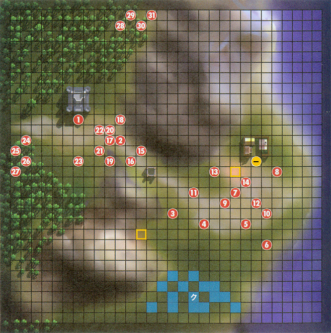 | 出击人数 15人 胜利条件 敵将撃破 虽然库罗姆、莉兹、弗雷德里克都能和姐姐对话,不过即使对话了姐姐也要过关后才会加入,所以对话事件可有可无。姐姐登场时位于地图右侧,如果全力赶过去援救的话也不是来不及,不过有不小的概率会被各种两格武器直接打死,所以还是用救援杖拉回来好了。用救援杖将姐姐拉到大部队的位置,然后就地布防即可。其中要特别小心敌人的黑天马,为了以防万一可以选择不组队直接布置人墙的战术。等第一批突击的清理完后就简单了,按部就班一点点推进。过关后姐姐加入时送リザーブ杖一把。 NPC エメリナ 賢者 Lv.10 敌方配置 カーン ソーサラー Lv.20 イル スライム 魔よけ(掉落) ギムレー教団 ソーサラー Lv.20 ルイン スライム×2 ギムレー教団 ソーサラー Lv.20 ルイン×2 ギムレー教団 ソーサラー Lv.20 イル×2 ギムレー教団 アサシン Lv.20 銀の弓 銀の剣×6 ギムレー教団 ダークナイト Lv.20 ボルカノン 銀の剣×4 ギムレー教団 ダークナイト Lv.20 トロン 銀の剣×3 ギムレー教団 ダークナイト Lv.20 レクスカリバー 銀の剣×3 ギムレー教団 ダークペガサス Lv.20 ボルカノン 銀の槍×5 ギムレー教団 ダークペガサス Lv.20 トロン 銀の槍×4(其中一个掉落金塊(中)) ギムレー教団 ダークペガサス Lv.20 レクスカリバー 銀の槍×5 村 左下 レスキュー |