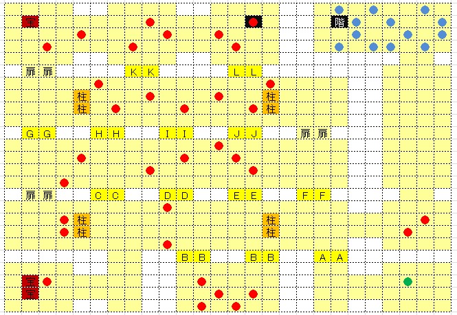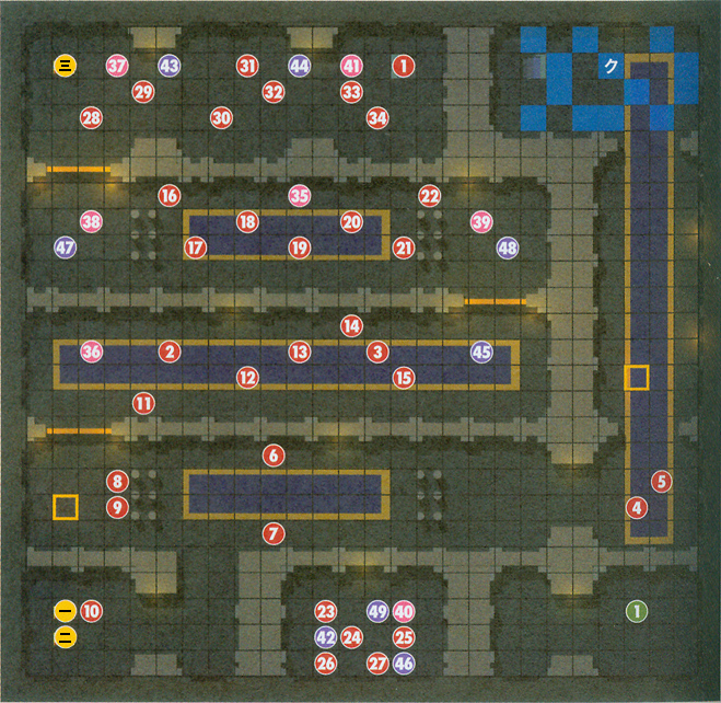 | 出击人数 13人 胜利条件 敵将撃破 恩恩可以用诺诺或库罗姆说得。本关的墙壁机关有些麻烦,前回合崩塌的地方次回合就有可能修复,但只要开了相应的门该栏所有的墙壁都会崩塌。D和A在房间内没有任何单位时修复。最上方的房间内所有敌人在开门前都不会有行动,开门同时房间里除BOSS外所有敌人开始冲锋,同时下回合KL墙壁塌陷。 ![]() T3 A,D两处崩塌 T4 D修复,C崩塌 T5 C修复,B,F,J三处崩塌 T6 F修复,E崩塌 T7 J修复,C,G两处崩塌 T8 C,G修复,F,H两处崩塌 T9 F,H修复,E,G两处崩塌 T10 E,G修复,D,J两处崩塌 T11 J修复,I崩塌 T12 D,I修复,F,H两处崩塌 T13 F,H修复,E,G两处崩塌 T14 E,G修复,D,J两处崩塌 T15 D,J修复,C,I两处崩塌 T16 C修复,F崩塌 T17 F修复,E崩塌 T18 E,I修复,D,J两处崩塌 T19 D,J修复,C,I两处崩塌 T20 C修复,F崩塌 T21 F修复,E崩塌 T22起循环T18至T21 NPC 第一回合 ンン マムクート Lv.10 竜石 敌方配置 1.屍兵将 ソーサラー Lv.14 イル 精霊の粉(掉落) 2-4,18,25-26,32.屍兵 ソーサラー Lv.7 5-6.屍兵 ゾンビ Lv.25 7,30.屍兵 マミー Lv.25 8-9,16,22,27,31,33.屍兵 ダークナイト Lv.7 10.屍兵 ジェネラル Lv.7 扉の鍵(掉落) 11,15,21,23,28,34.屍兵 ジェネラル Lv.7 12,14,19,24,29.屍兵 ウォーリアー Lv.7 17.屍兵 ジェネラル Lv.7 扉の鍵(掉落) 20.屍兵 ソーサラー Lv.7 宝の鍵(掉落) H: 35.ソーサラー 36-37.ダークナイト 38-41.ジェネラル L: 42-44.ソーサラー 45-46.ダークナイト 47-48.ジェネラル 49.ジェネラル 宝箱 一 チェンジプルーフ 二 リカバー 三 金塊(中) |