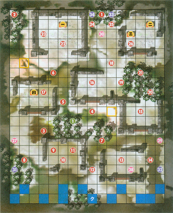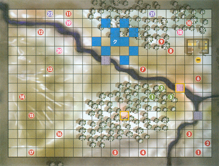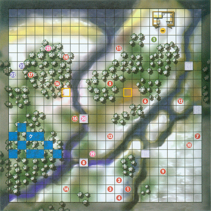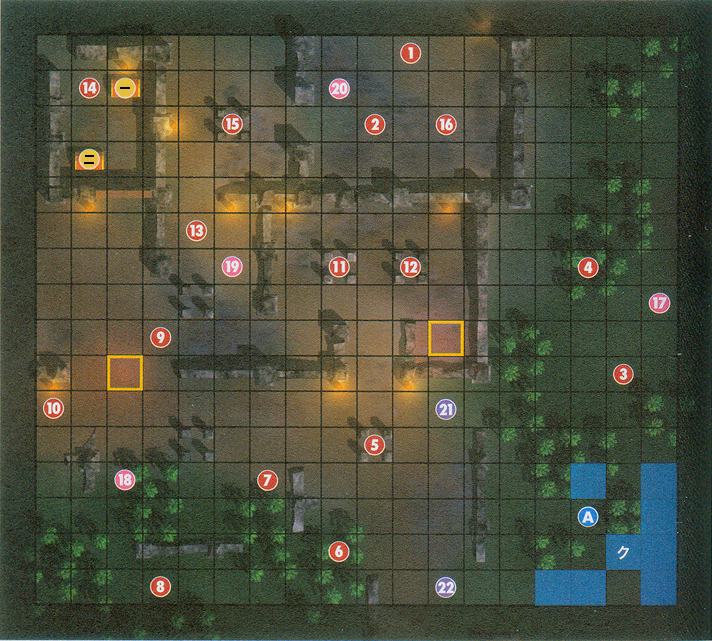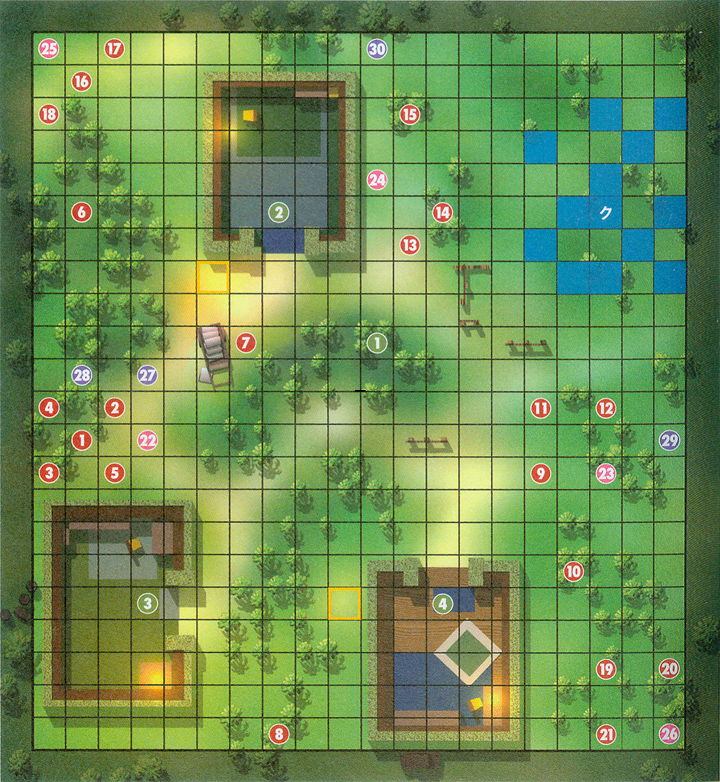 | 出击人数 12人 胜利条件 敵全滅 我方加入人员: ウード 剣士 LV10 库洛姆或莉兹和伍德对话后,伍德加入己方队伍。或者是map clear后伍德生存,伍德加入己方队伍。 随便说一下战术方面的问题。 培养过亲代的话因为伍德的能力值和技能配置我们不用担心,往上方的房门口一站自保能力还是有的。再加上本关的敌人用斧的比较多,所以完全不用担心,但是另外两位村民就没有那么好运了,我们必须加足马力才能救到他们,这边无论如何都要推荐一下移动之叫这个技能,没有的话,想要救到左下角的村民大概是相当的困难的。 在击破次序方面,优先击破带着银弓的暗杀者,他们的输出值相当的高,不能大意。 在三个村民的回合他们会使用远程回复杖帮我们补血。和他们对话分别可以获得回礼。(ウード与村人4对话获得专用剑术ミステルトィン BOSS依然是个斧男,三下两除二就把他干掉的情况下我就不多给出文字叙述了。 敌方配置: 1.格兹高(ゲツコー) 暗杀者 (横转证) 2.蛮族 3.蛮族(L:暗杀者) 4.暗黑法师 5.暗黑法师 6.剑士 7.暗黑法师 8.蛮族 9.剑士 10.蛮族 11.暗黑法师 12.剑士 13.蛮族 14.蛮族 15.剑士 16.狂战士 17.龙骑士 18.龙骑士 19.暗杀者 20.龙骑士 21.龙骑士 H: 22.狂战士 23.狂战士 24.暗杀者 25.龙骑士 26.龙骑士 L: 27.蛮族 28.暗杀者 29.暗杀者 30.狂战士 对话获得: 与村人2对话获得特效药 与村人3对话获得精灵之粉 与村人4对话获得速度之药,伍德与村人4对话获得魔剑米斯特鲁汀。 |