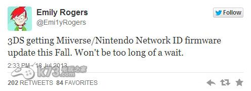 确认将于2013年上线的3ds任天堂网络ID(Nintendo Network ID)好友系统正式确认将于2013年秋季进行固件的配信升级,Miiverse将会追加到3ds主机中使用,这一消息来源自Nintendo Force作者Emily Rogers。