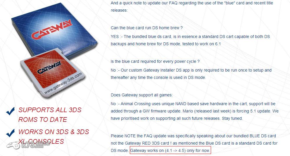 从上图下方红框标注的地方可以看到,“Gateway works on(4.1->4.5)only for now”(Gateway烧录卡目前只能在4.1-4.5 3ds系统上运行)!所以大家已经将系统升级为4.5以上系统的玩家就不要多做指望了,或者等待官方后续的破解好消息。