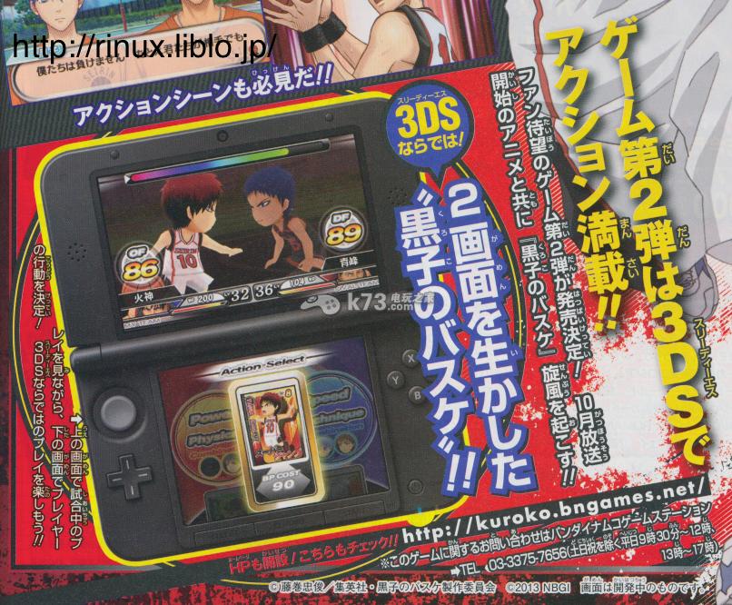 本周的周刊少年Vjump杂志图公开了NBGI将于3ds平台独占发售的奇迹篮球游戏《黑子的篮球 迈向胜利的奇迹》的全新杂志图,杂志图首度公开了游戏的实机画面,各位喜欢黑子的篮球动漫的玩家们可不要错过这次的报道哟!