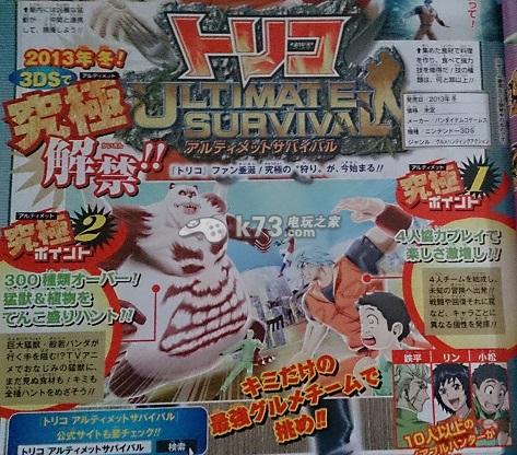NBGI官方于本周刊少年Jump杂志图上公开了其将于2014年1月28日登陆3ds平台的动作冒险游戏《美食猎人究极生存战(トリコ アルティメットサバイバル)》的最新情报,游戏中新确认登场的隐藏boss情报首次得到了公开,以下是详细介绍。