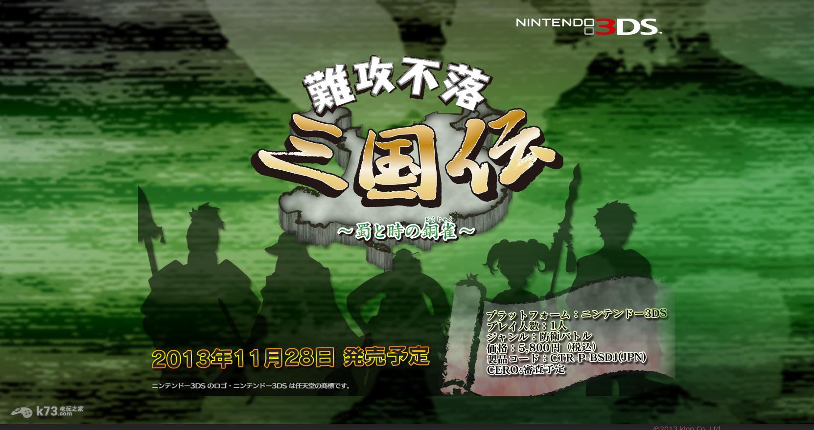《难攻不落三国传 蜀与时之铜雀》将于2013年11月28日发售,类型为防守战斗游戏,只支持1人游戏,价格为5800日元。