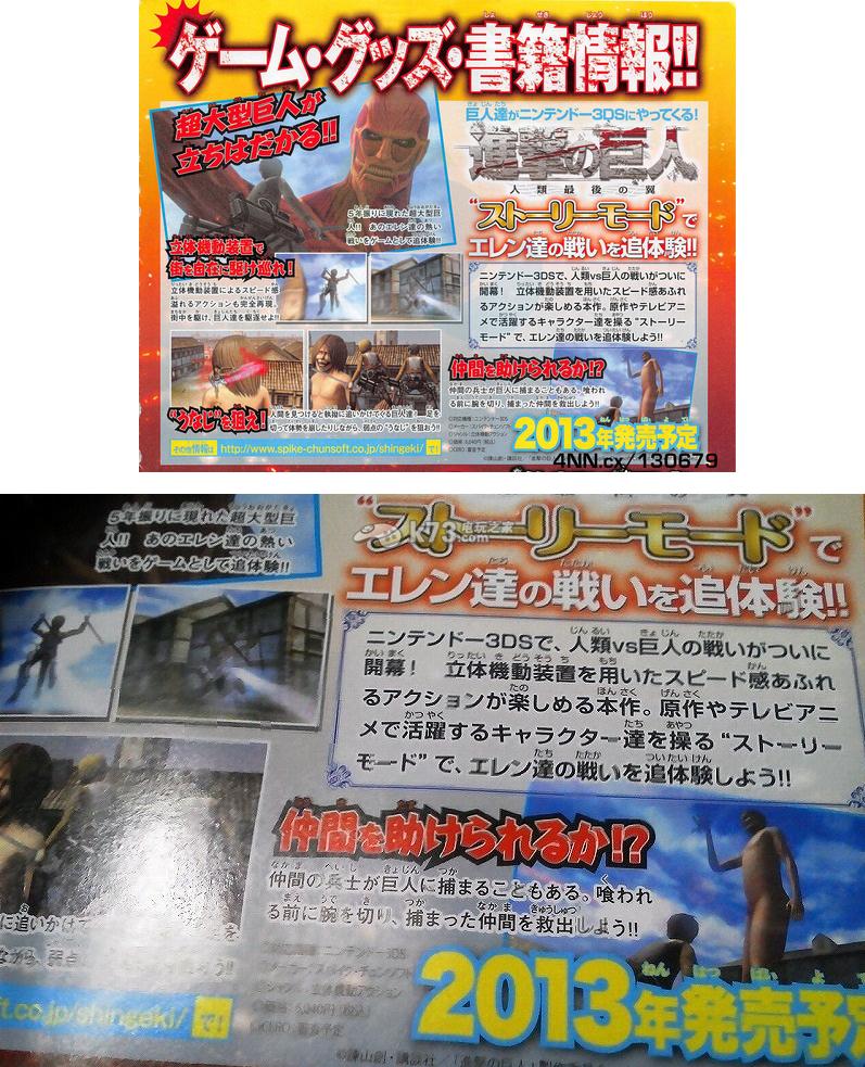 日前,网络上流出了两张3ds《进击的巨人》的Vjump 杂志扫描图,这两张杂志图首次公开了游戏的实机画面,同时得到判明的还有游戏的类型和部分游戏模式。