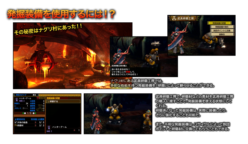本作的挖掘装备系统需要拥有研磨材等必要素材,是通过挖掘来获得装备的一种手段,这些装备同样可以进行强化,不需要的装备也可以通过与回收所交换旅团点数和研磨材料。