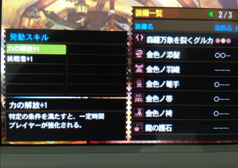 如果有好的配装...会再研究看看,这是普通金狮子套装,还有一套基础防御81的怒金狮套,一样需要破角出特殊的素材,罗刹之角,非常难破,金狮子脑袋两只角各有500的部位耐性,也就是破头要1000..1000什幺概念呢?大概是7只熊活头,4.5只金火头..当然,雌火金火相对吸收较高一点..但是也非常难破。