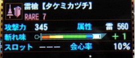 雷属性长枪个人推荐麒麟长枪,优点高雷属性,高白斩,自带10会心,打弱雷的怪物非常给力。还有把是大鬼枪非常可惜的是没有白斩,高物理也变的没太大优势。
